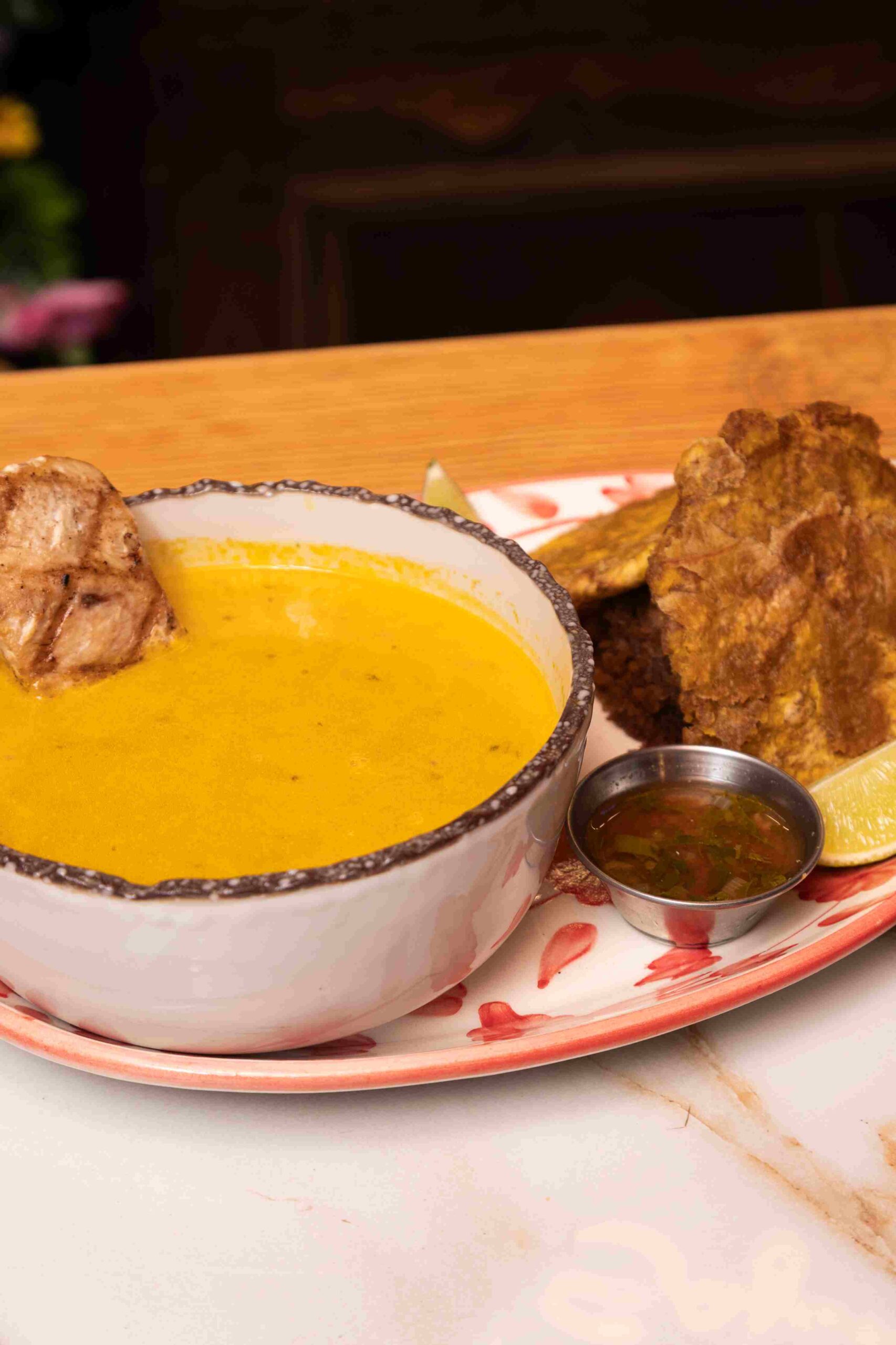 Sancocho de bagre estilo caribeño, con camarones, acompañado de arroz de coco y patacones.