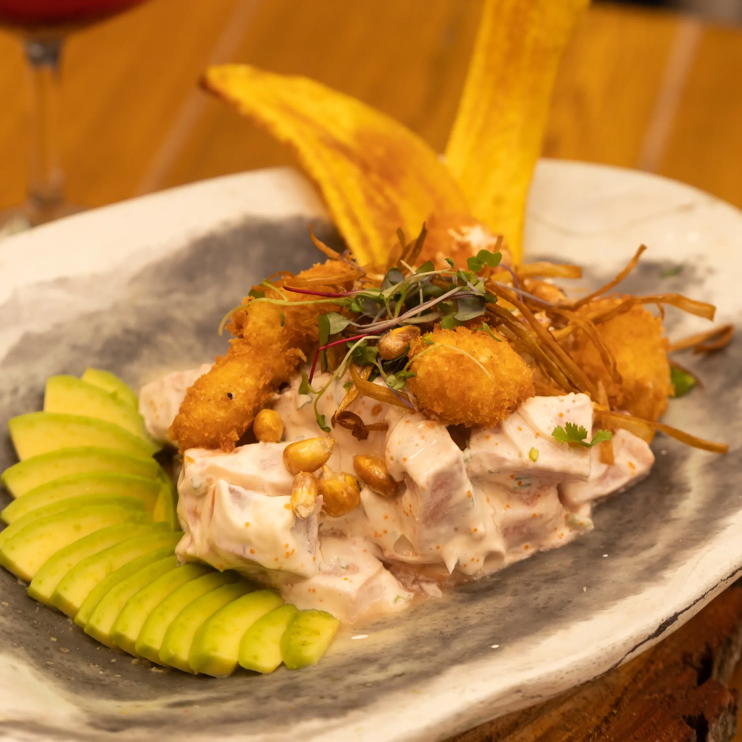 Ceviche cremoso preparado con cubos de salmón, julianas de palmito osaqui, langostino crispy, cebolla, atún en dados, marinado con togarashi, jugos de cítricos y decorado con caviar de cangrejo.